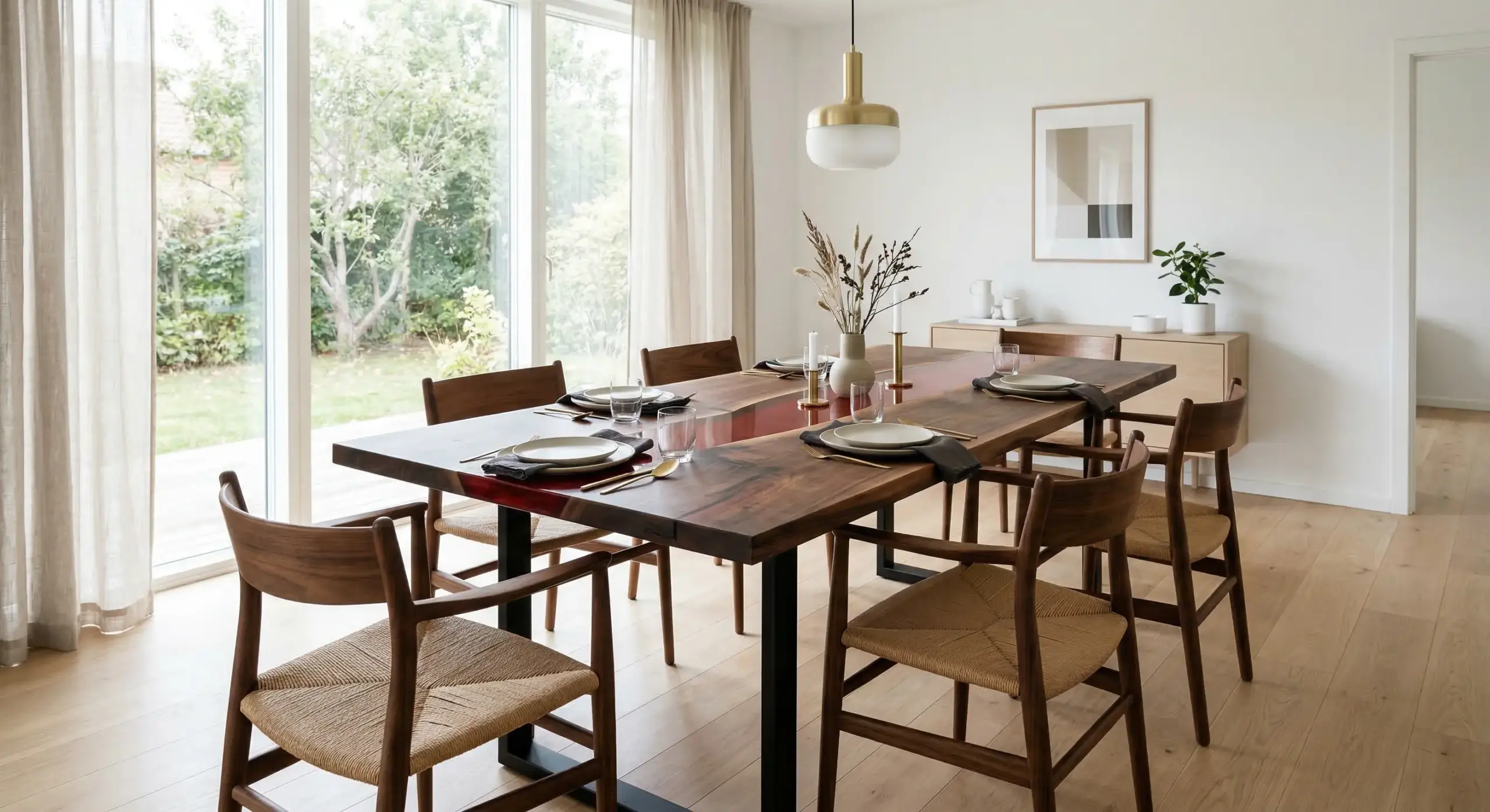 Creăm spații care respiră, îmbinând echilibrul natural al lemnului masiv cu inovația rășinii epoxidice.